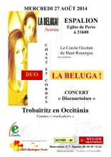 Dimècres 27 d'agost, a nòu oras, dins la glèisa de Pèrsa, lo cèrcle occitan de Nalt-Roergue convida al concèrt "Discourtoises" del duò "Beluga", solistas de "Troubadours Art Ensemble", grop de referéncia.